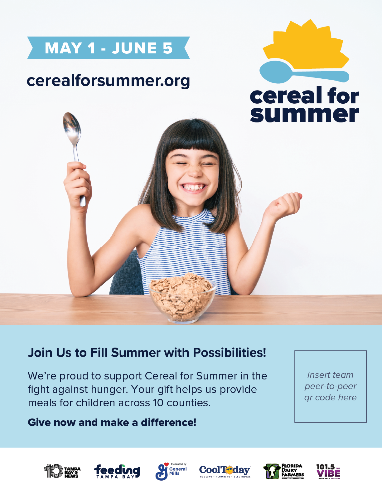 Summer is a time to grow, learn, and play – but for children across our community, summer is a time where daily school meals stop and hunger begins. With 1 in 4 children in our area not sure where their next meal will come from, Cereal for Summer can keep kids nourished and active during the summer months. Your gift today can give a child in need a full week of summer adventure and the possibility of a healthier future.